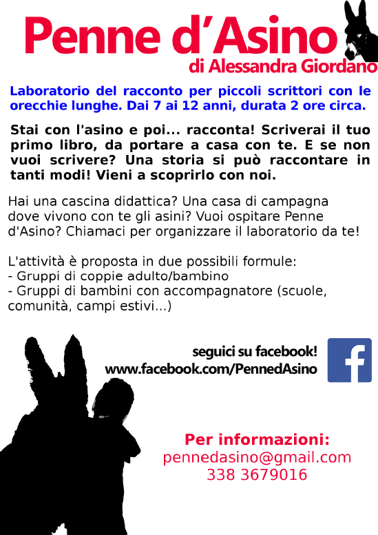 I bambini sono invitati a immaginare se stessi nel ruolo di scrittori professionisti, con il compito – conferito loro da un editore – di scrivere il proprio racconto sull’asino. In una prima fase, in uno spazio coperto (laboratorio chiuso in inverno, spazio esterno con tettoia in estate) ci prepariamo all’esperienza dell’essere scrittori. Quindi entreremo nel recinto con l’asino, libero, per conoscerlo da vicino (lo strigliamo, lo abbracciamo, lo osserviamo, lo conduciamo a fare un piccolo giro, gli diamo la carota…). Poi, tornati nello spazio iniziale, scriviamo il racconto. Perché il laboratorio possa includere ogni personalità e competenza, e anche eventuali disabilità, alla scrittura potrà sostituirsi qualsiasi altra forma di racconto dell’esperienza: un disegno, una canzone, una poesia, una danza…